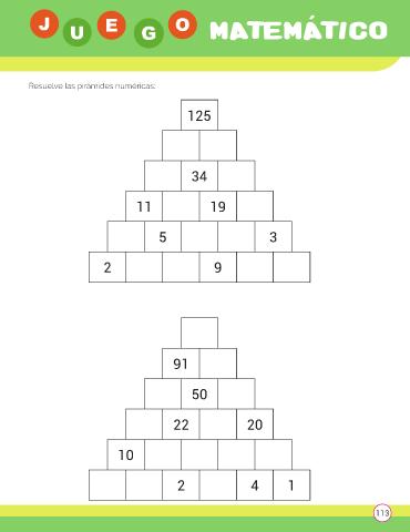 J U E G O Resuelve las pirámides numéricas: 125 34 11 19 5 3 2 9 91 50 22 20 10 2 4 1 113