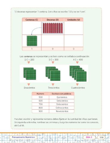 10 decenas representan 1 centena. Con cifras se escribe 100 y se lee “cien”.