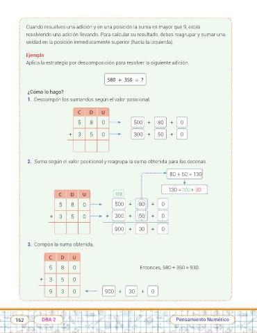 2. Suma según el valor posicional y reagrupa la suma obtenida para las decenas.