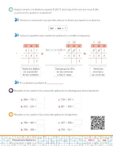 2 Ángela compró una alcancía y guardó $ 567. Si al día siguiente tuvo que sacar $ 384,
