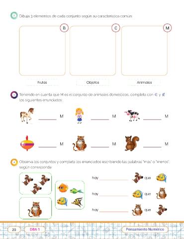 4 Observa los conjuntos y completa los enunciados escribiendo las palabras “más” o “menos”,
