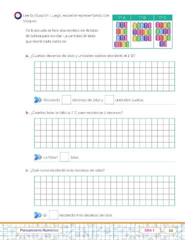 7 a. ¿Cuántas decenas de latas y unidades sueltas recolectó el 1° B?