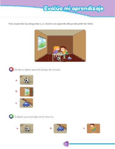 Para responder las preguntas 1 y 2, observa el siguiente dibujo del jardín de niños. 1 Señala el objeto que está debajo de la mesa: 6 2 7 3 a. 8 4 9 b. 5 c. 1 6 2 El objeto que está lejos de la mesa es: 7 3 8 4 a. 9 b. c. 5 55