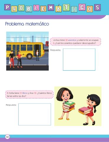 P R O B L E M A T I C O S Problema matemático Un bus tiene 30 asientos y solamente se ocupan 6 ¿Cuántos asientos quedaran desocupados? Respuesta: Si Sofía tiene 24 libros y Ana 18. ¿Cuántos libros tienen entre las dos? Respuesta: 60