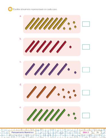 9 3 1 2 10 11 12 4 Escribe el número representado en cada caso. 5 13 a. 6 14 7 15 8 16 b. c. d. e. Pensamiento Numérico DBA 3 71